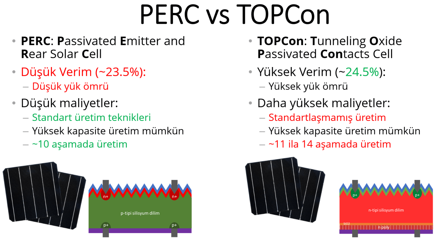 Günümüzde yaşadığımız bu değişikliklerin en önemlilerinden biri olan dilim katkılama türünün p-tipinden n-tipine geçişi, yarı-iletken kristaller içerisinde bulunan yük taşıyıcıların yük ömürlerinin (lifetime) artmasını sağlayarak birim alandan daha yüksek voltaj ve akım toplanmasını – hücrelerin daha verimli hale gelmesini sağlamıştır. P-tipinden n-tipine geçişte, standart teknoloji olan p-PERC mimarisi geride bırakılarak, n-tipi TOPCon mimarisine geçilmiştir. TOPCon yapıda, PERC hücrelerde arka yüzeyde lazer ile açılan kontak noktalarında oluşan yük ömründeki düşüş, birkaç nanometre kalınlığı geçmeyen oksit tabakalarda oluşan kuantum mekanik tünelleme yöntemi ile sıfıra indirilerek hücrenin açık devre voltajının artması sağlanmıştır. Zaten TOPCon (Tunnellin Oxide Passivating Contacts) ismi de “tünelleme oksiti ile pasivasyonu sağlanan kontaklar” şeklinde tercüme edilebilir.